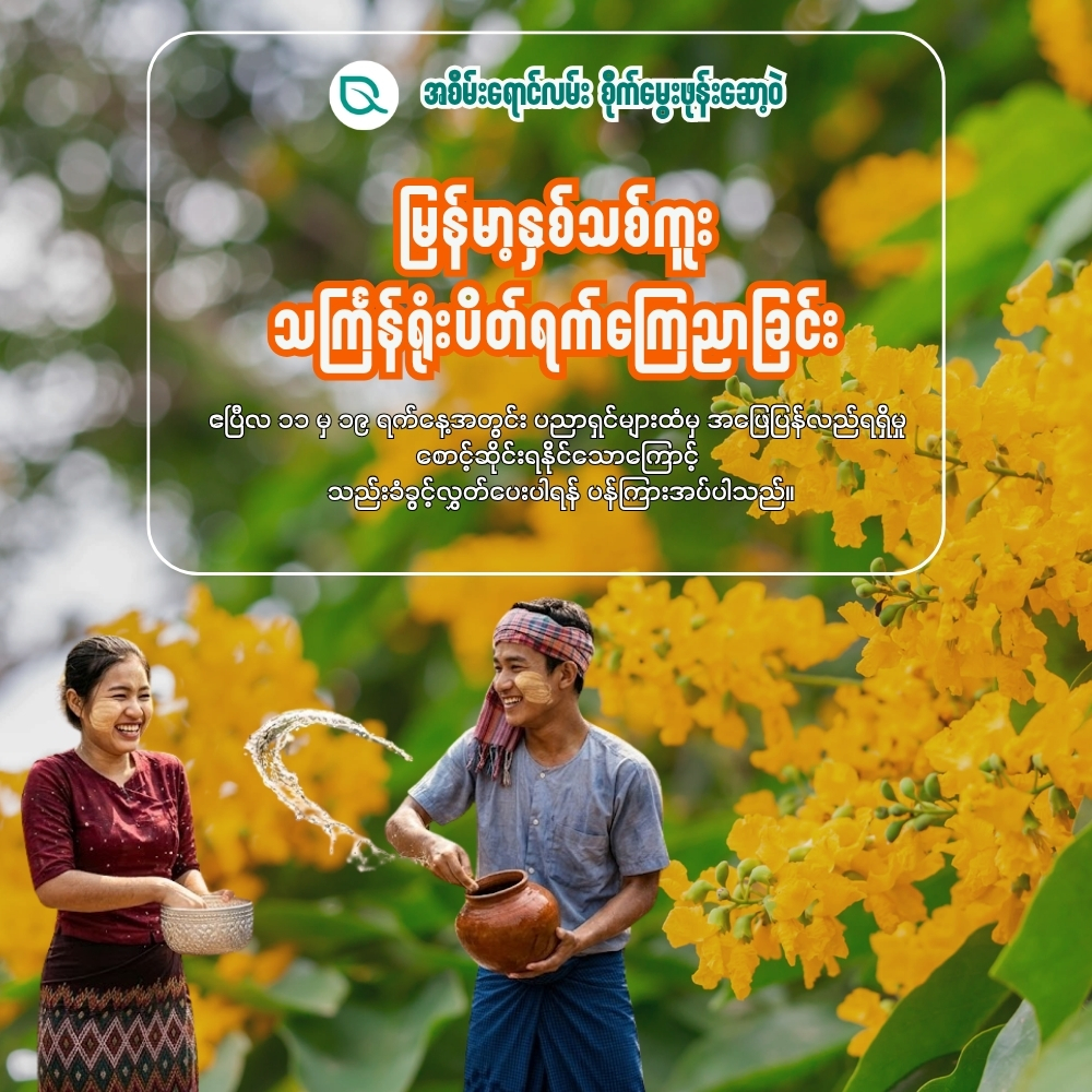 နှစ်သစ်အခါသမယမှာ ကျွန်မတို့ရဲ့ မိတ်ဆွေတောင်သူဦးကြီးဒေါ်ကြီးတို့အားလုံး ဘေးဘယာဝေးကွာပြီး စိတ်၏ချမ်းသာခြင်း ကိုယ်၏ကျန်းမာခြင်းနဲ့ ပြည့်စုံကြပါစေလို့ အစိမ်းရောင်လမ်းက ဆုမွန်ကောင်းတောင်းလိုက်ရပါတယ်...