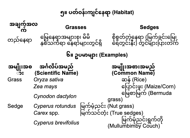 အချက်အလက် Grasses (မြက်မျိုး) Sedges (မြက်မုံညင်းမျိုး)