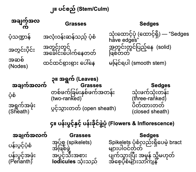 Grass (မြက်မျိုး) နဲ့ Sedge (မြက်မုံညင်းမျိုး) တို့အကြား ခြားနားချက်များ