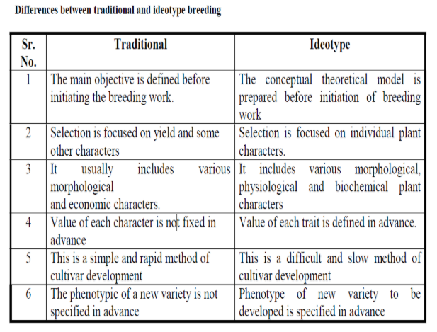 တစ်ဖန်ပုံမှန်အပင်မျိုးမွေးမြူခြင်းနည်းလမ်း (Traditional Plant Breeding) နှင့် အ ကောင်းဆုံးအပင်ပုံစံရရှိစေရန် မွေးမြူခြင်းနည်းလမ်း (Ideotype Plant Breeding) များကလည်း ကွာခြားပါသည်၊