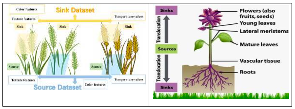 ထုတ်လုပ်မှုအရင်းအမြစ် (Source) မှာ အာဟာရ ထုတ်လုပ်ပေးသော/အစာချက်လုပ်ပေး သော အရွက်နှင့် ပင်စည်များ ဖြစ်ပြီး လက်ခံမှု (Sink) မှာ ထိုအာဟာရကို သိုလှောင်ထား မည့် အစေ့အဆန်များ ဖြစ်သည်။ အပင်ပုသော မျိုးများတွင် ဥပမာ - Sink (အစေ့အရေ အတွက်) များပြားသော်လည်း Source (အရွက်ဧရိယာ) နည်းပါးသွားပါက အစေ့များ သေး၊ အလေးချိန် နည်းသွားတတ်သည်။