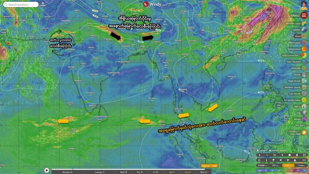 🔸 တောင်တရုတ်ပင်လယ်အတွင်း အရှေ့မြောက်မုတ်သုံလေဆက်လက်အားကောင်းနေပြီး အိန္ဒိယနိုင်ငံမြောက်ပိုင်းမှ အနောက်မြောက်လေစီးကြောင်းသည်လည်း အိန္ဒိယ-ပါကစ္စတန်နယ်စပ်အနီးမှ လက်ယာရစ် Anti-Cyclonic လေဝဲကြောင့် အားကောင်းနေပါတယ်။ မြန်မာနိုင်ငံမြောက်ပိုင်းဒေသများမှာ မိုးထစ်ချုန်းရွာနိုင်ပြီး မိုးများနိုင်မည့်အခြေအနေများဆက်လက်ဖြစ်ပေါ်နေနိုင်ပါမယ်။