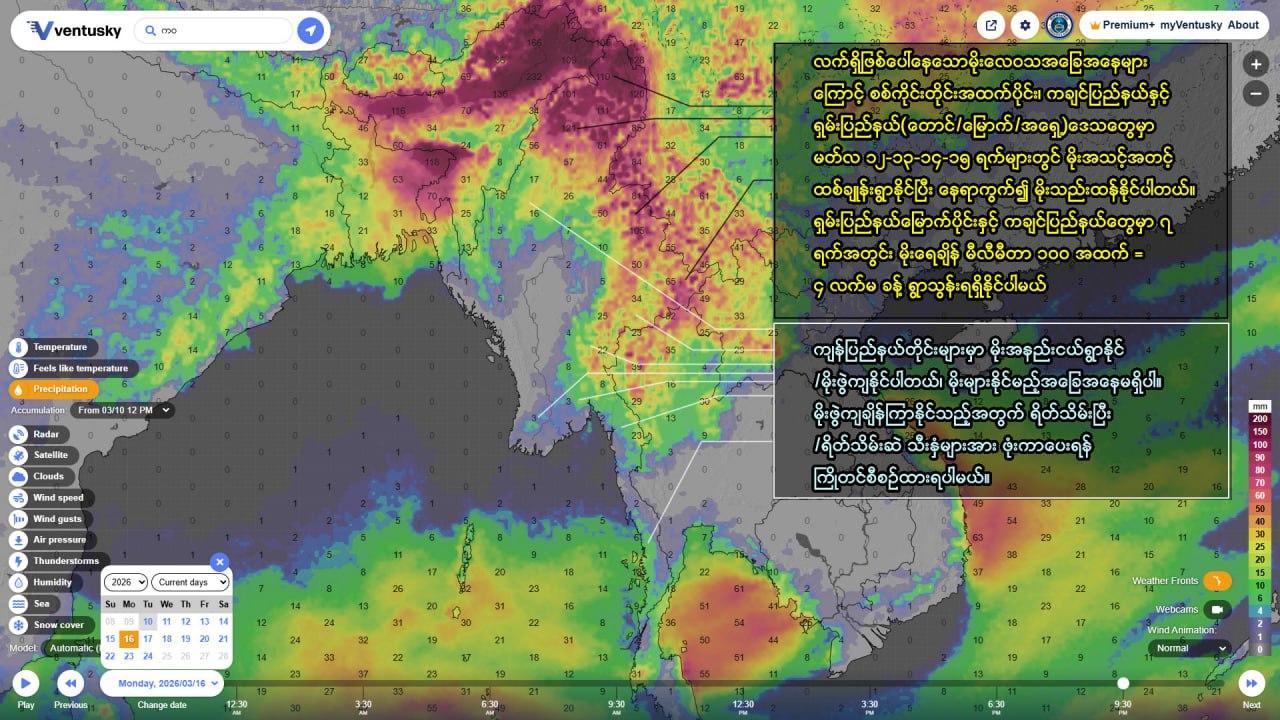 🔸 တောင်တရုတ်ပင်လယ်၊ ထိုင်းပင်လယ်ကွေ့တို့မှတဆင့် တနင်္သာရီတိုင်းတောင်ပိုင်းကိုဖြတ်သန်း၍ ကပ္ပလီပင်လယ်/ဘင်္ဂလားပင်လယ်အော်တို့မှတဆင့် မြန်မာနိုင်ငံအနောက်ဘက်ကမ်းရိုးတန်းကိုဖြတ်၍ ဝင်ရောက်လာသော လေစီးကြောင်းနှင့်အတူပါလာသည့် မိုးတိမ်များကြောင့် ယနေ့(မတ်လ ၁၀ ရက်မှ မတ်လ ၁၆ ရက်အထိ ၇ ရက်အတွင်း မိုးအုံ့နိုင်၊ မိုးဖွဲကျနိုင်ပါမယ်။ မိုးများနိုင်သည့်အခြေအနေမရှိပါ။
