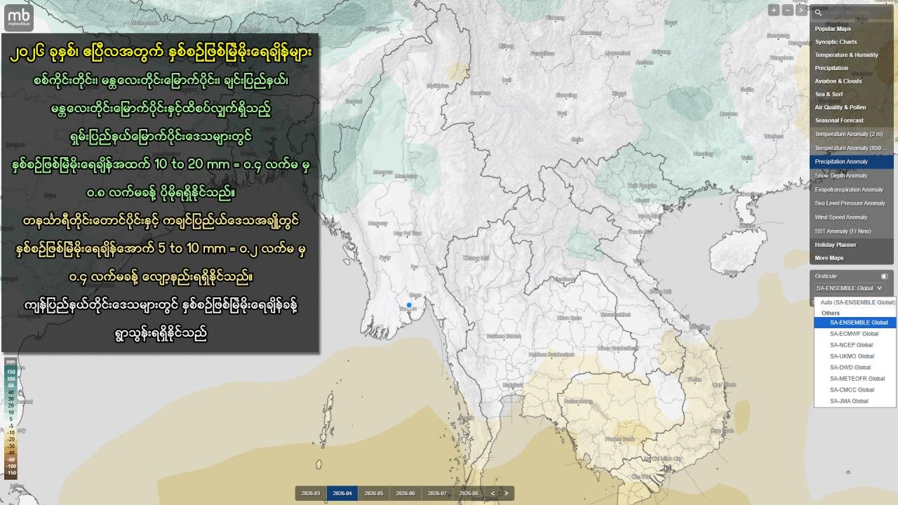 မတ်လ ၂၉ ရက် နေ့လည် ၂ နာရီ - Meteoblue Seasonal Forecasts မှ ရရှိသော ဒေတာများအရ