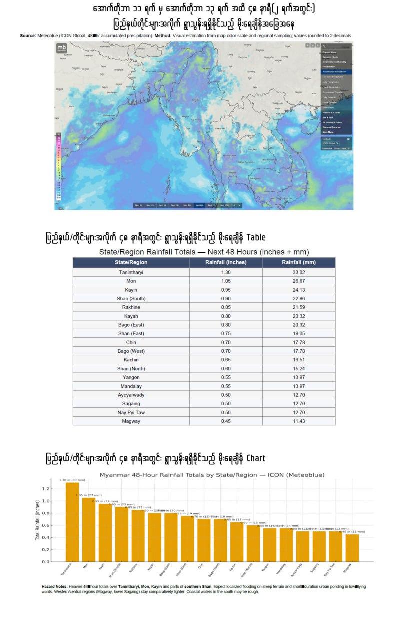 တနင်္သာရီတိုင်းနှင့် မွန်ပြည်နယ်တွေမှာ ၄၈ နာရီအတွင်း မိုးရေချိန် ၁ လက်မအထက်ရွာသွန်းရရှိနိုင်ပြီး မိုးအနည်းငယ်ပိုနိုင်ပါတယ်။