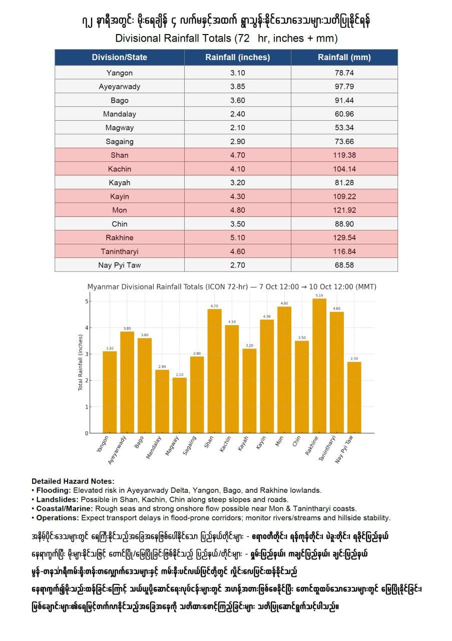 🔸နေရာကွက်၍မိုးသည်းထန်ခြင်းကြောင့် စိုက်ပျိုးမြေများနှင့် အနိမ့်ပိုင်းလူနေရပ်ကွက်များ၊ လမ်းပန်းဆက်သွယ်မှုပြတ်တောက်နိုင်ခြင်းများ ဖြစ်ပေါ်နိုင်သည့်/ဖြစ်ပေါ်တတ်သည့် ပြည်နယ်တိုင်း/ဒေသများရှိနိုင်ပါသည်။