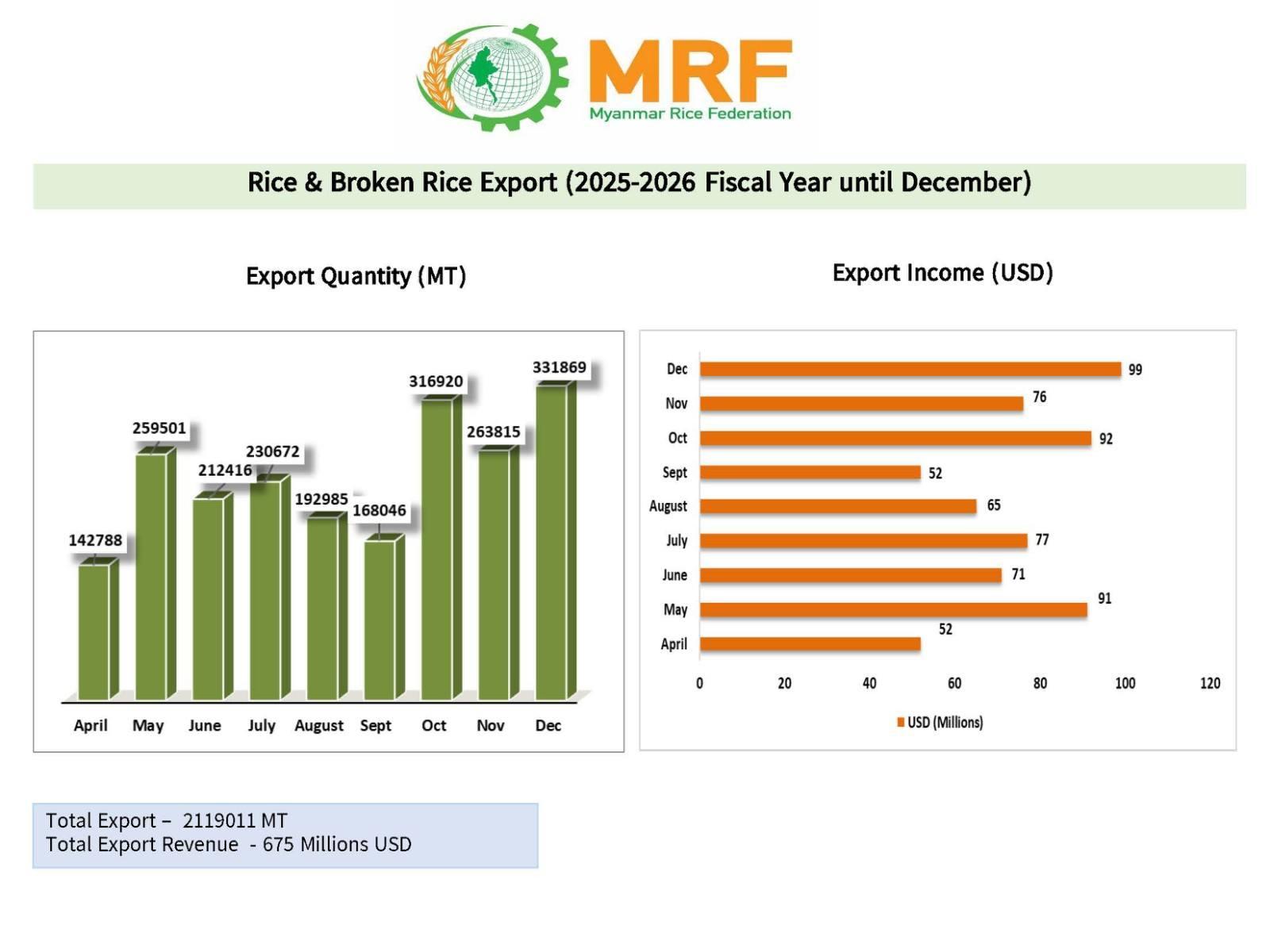 ပြီးခဲ့သည်ဘဏ္ဍာနှစ် (၂၀၂၄-၂၅) ဧပြီမှ ဒီဇင်ဘာလအထိ ဆန်နှင့် ဆန်ကွဲပြည်ပတင်ပို့မှုမှ ဒေါ်လာ ၆၃၆ သန်းရရှိပြီး ယခုဘဏ္ဍာနှစ်တွင်ဒေါ် လာ ၆၇၅ သန်း ရရှိထားသည်။
