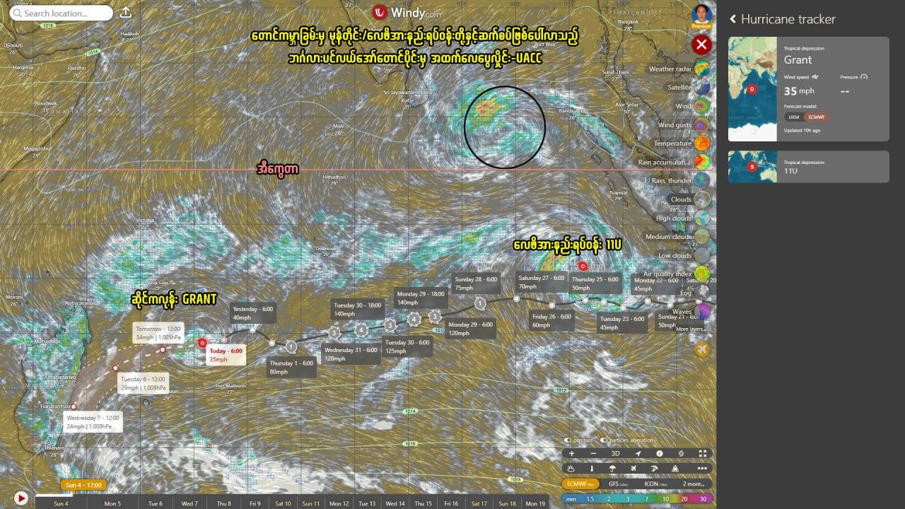 🔸 အိန္ဒိယသမုဒ္ဒရာတောင်ပိုင်းတွင်ဖြစ်ပေါ်လျက်ရှိသည့် ဆိုင်ကလုန်းမုန်တိုင်း GRANT၊ လေဖိအားနည်းရပ်ဝန်း-Depression 11U တို့၏အရှိန်ကြောင့် ဘင်္ဂလားပင်လယ်အော်တောင်ပိုင်း အထက် ၅.၈ ကီလိုမီတာအမြင့် (ပေ ၁၉,၀၀၀) မှာ အထက်လေပွေလှိုင်းတခုဖြစ်ပေါ်လျက်ရှိပါတယ်။ အဆိုပါလေပွေလှိုင်းသည် ဇန်နဝါရီ ၁၀ ရက်အထိဆက်လက်တည်ရှိနိုင်ပြီး အားပိုကောင်းလာနိုင်သည့်အခြေအနေမရှိပါ။