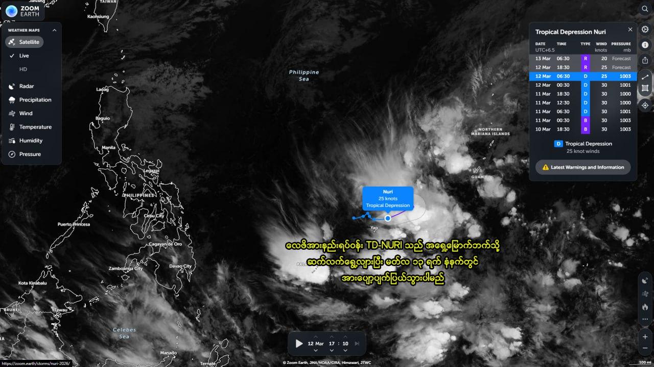 ဖိလစ်ပိုင်နိုင်ငံအရှေ့ဘက် မိုင် ၉၀၀ ခန့် ပစိဖိတ်အနောက်မြောက်သမုဒ္ဒရာတွင် လေဖိအားနည်းရပ်ဝန်း TD “NURI” အရှေ့မြောက်ဘက်သို့ရွေ့လျားနေပြီး တဖြည်းဖြည်းအားလျော့ ပျက်ပြယ်သွားနိုင်ပါတယ်။ တောင်တရုတ်ပင်လယ်အတွင်း အရှေ့မြောက်မုတ်သုံလေအား ဆက်လက်ကောင်းနေပါတယ်။