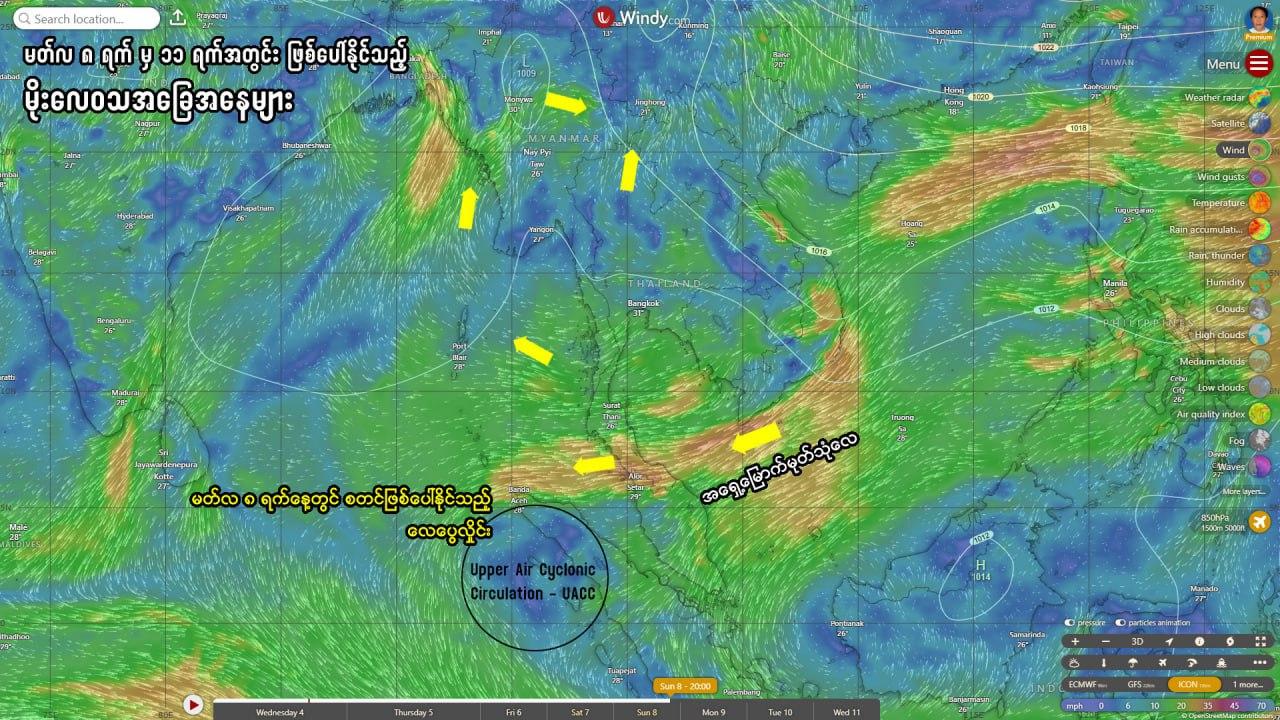 ဘင်္ဂလားပင်လယ်အော်အရှေ့တောင်ပိုင်းနှင့် အာရေဗျပင်လယ်တို့တွင် အထက်လေပွေလှိုင်း Upper Air Cyclonic Circulation – UACC များ ဖြစ်ပေါ်လျှက်ရှိပြီး မတ်လ ၉ ရက်နေ့အထိ ဆက်လက်ရှိနေနိုင်သည်။